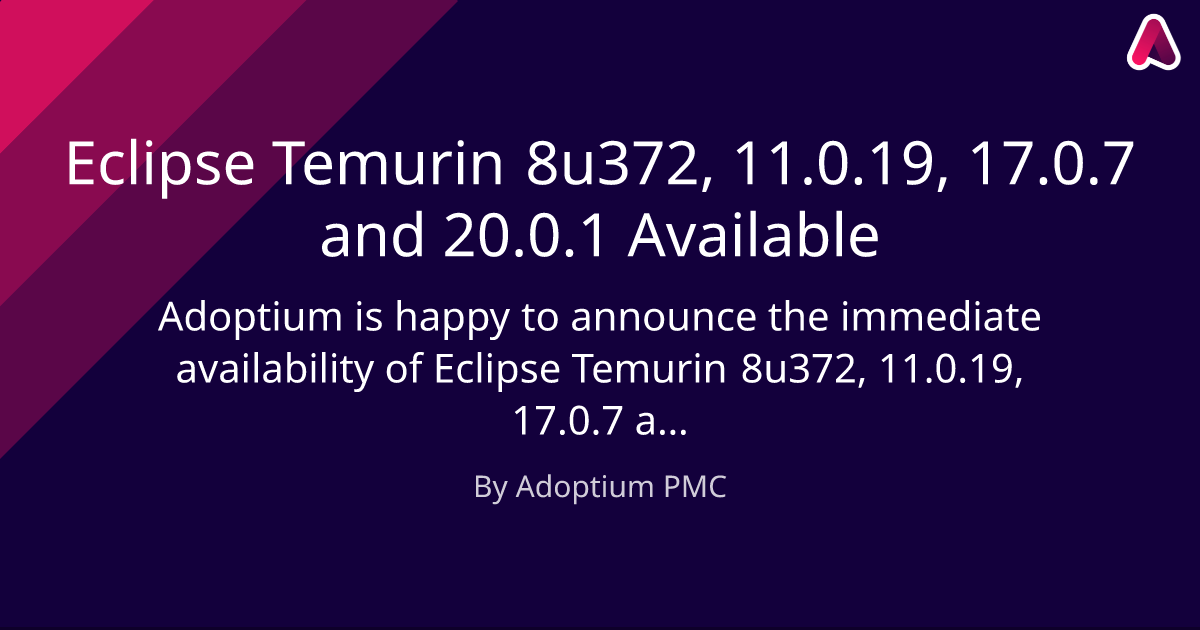 Adoptium is happy to announce the immediate availability of Eclipse Temurin 8u372, 11.0.19, 17.0.7 and 20.0.1.
